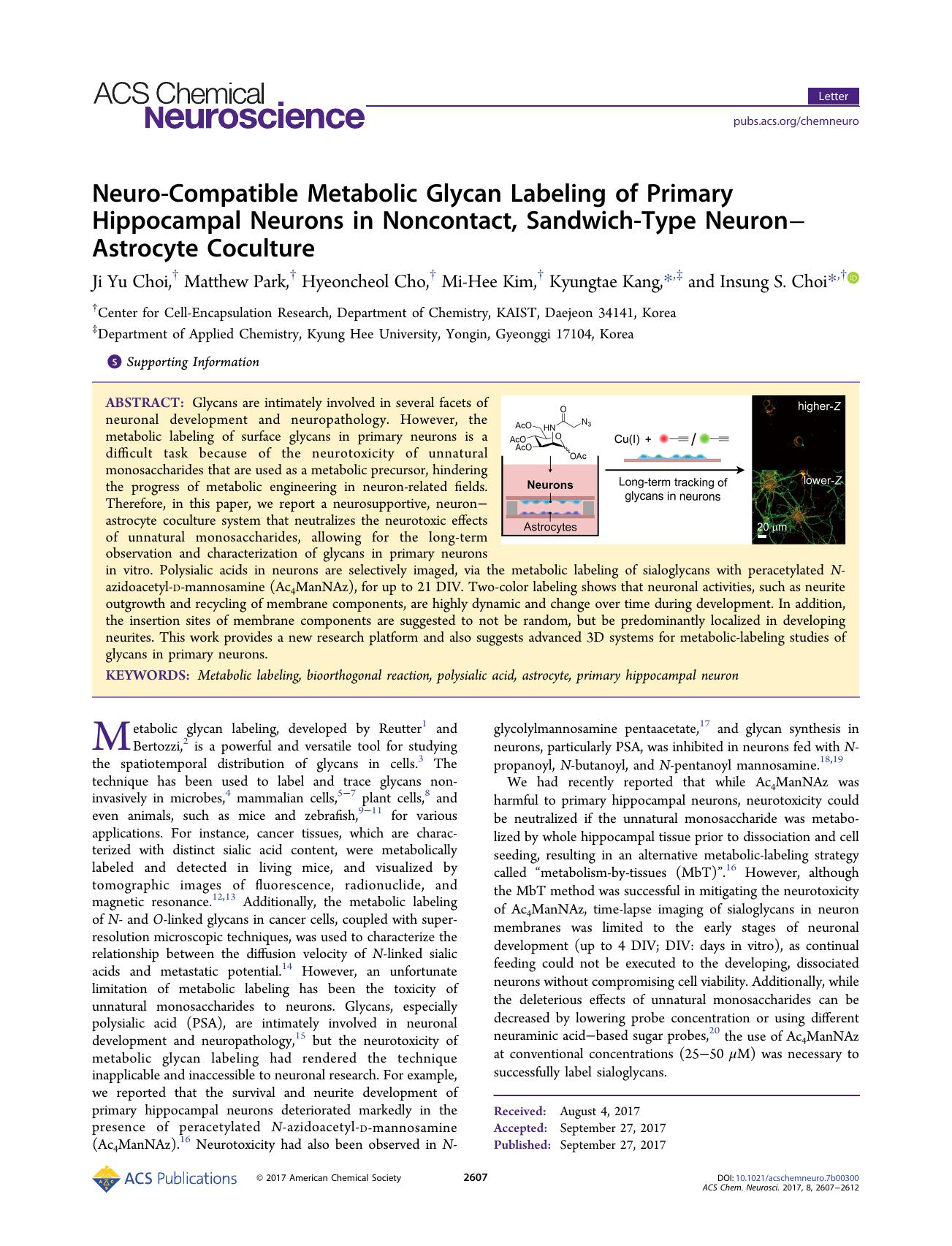 Neuro-Compatible Metabolic Glycan Labeling of Primary Hippocampal Neurons in Noncontact, Sandwich-Type NeuronâAstrocyte Coculture by Ji Yu Choi Matthew Park Hyeoncheol Cho Mi-Hee Kim Kyungtae Kang and Insung S. Choi