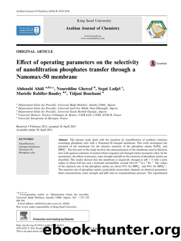 Effect of operating parameters on the selectivity of nanofiltration phosphates transfer through a Nanomax-50 membrane by Abdenabi Abidi & Noureddine Gherraf & Segni Ladjel & Murielle Rabiller-Baudry & Tidjani Bouchami