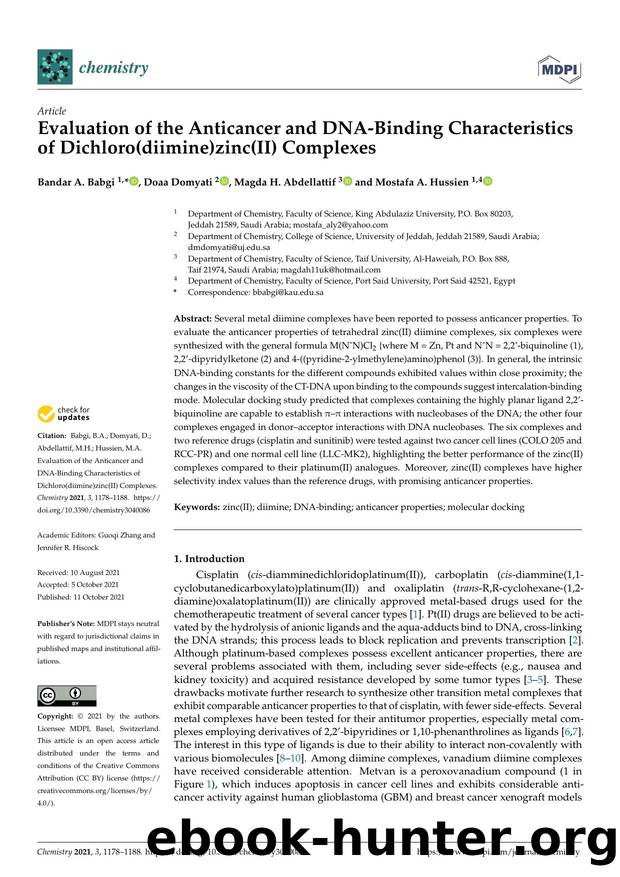 Evaluation of the Anticancer and DNA-Binding Characteristics of Dichloro(diimine)zinc(II) Complexes by Bandar A. Babgi Doaa Domyati Magda H. Abdellattif & Mostafa A. Hussien