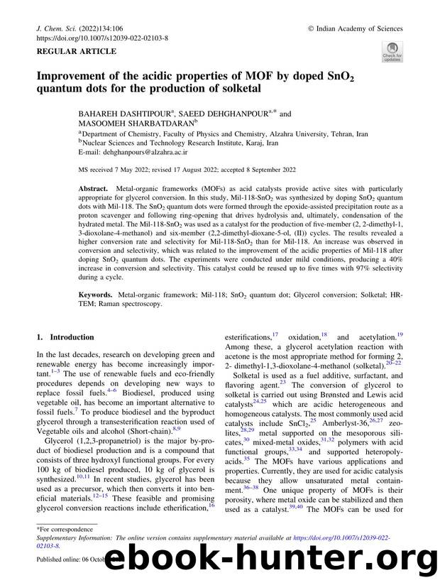 Improvement of the acidic properties of MOF by doped SnO2 quantum dots for the production of solketal by Bahareh Dashtipour & Saeed Dehghanpour & Masoomeh Sharbatdaran