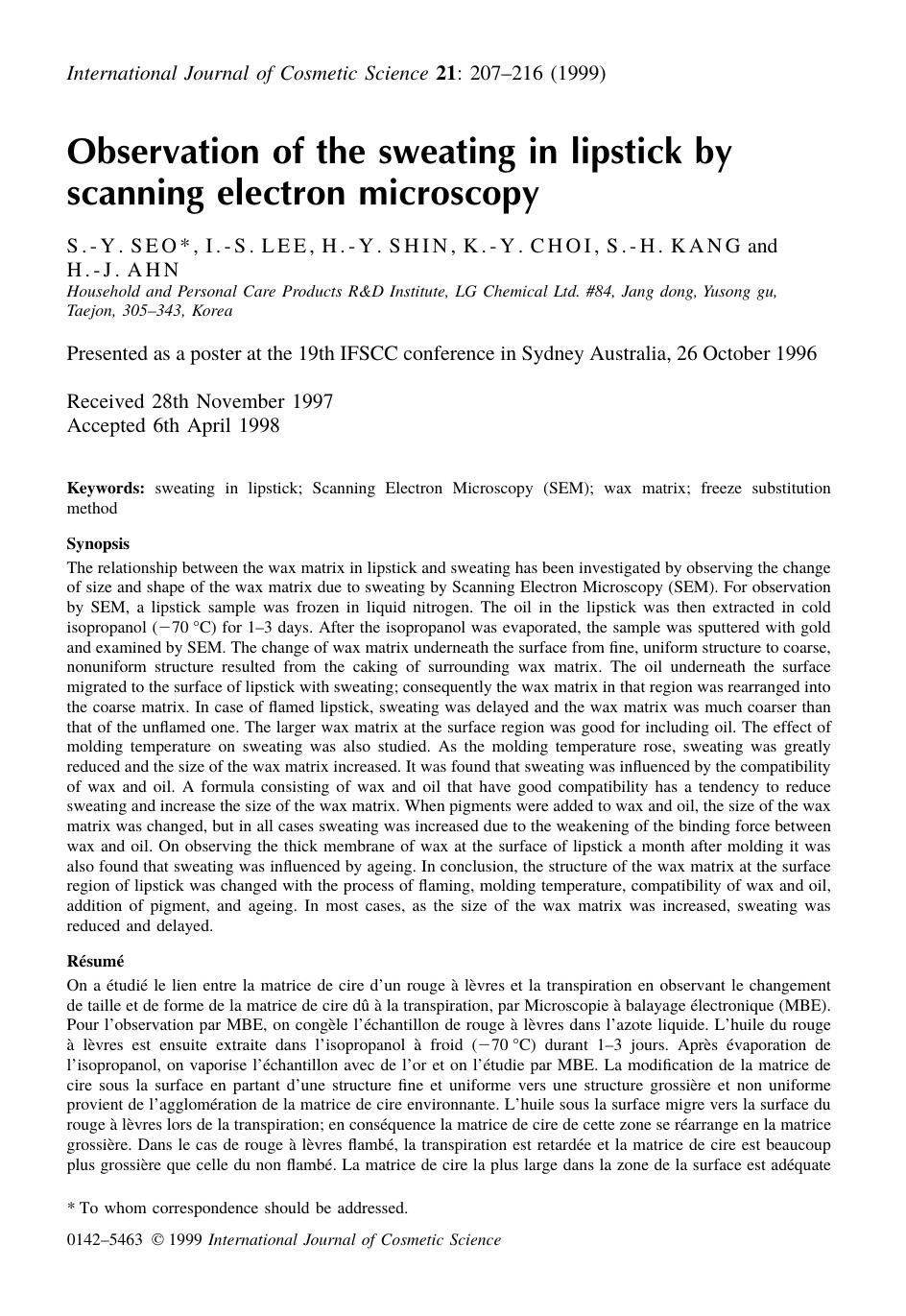 Observation of the Sweating in Lipstick by Scanning Electron Microscopy by S .-Y . SEO* I .-S . LEE H .-Y . SHIN K .-Y . CHOI S .-H . KANG and