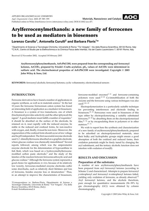 Arylferrocenylmethanols: a new family of ferrocenes to be used as mediators in biosensors by Unknown