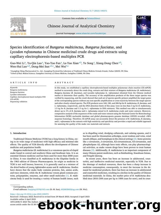 Species identification of Bungarus multicinctus, Bungarus fasciatus, and Lycodon rufozonatus in Chinese medicinal crude drugs and extracts using capillary electrophoresis-based multiplex PCR by unknow